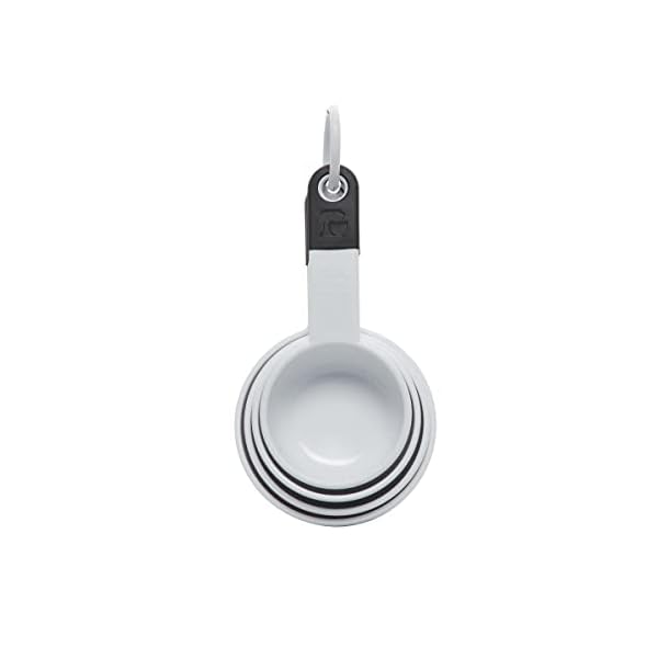 Armazenamento organizado: os copos de medida se encaixam um dentro do outro e são mantidos juntos com um anel de plástico espesso para garantir fácil organização e armazenamento.